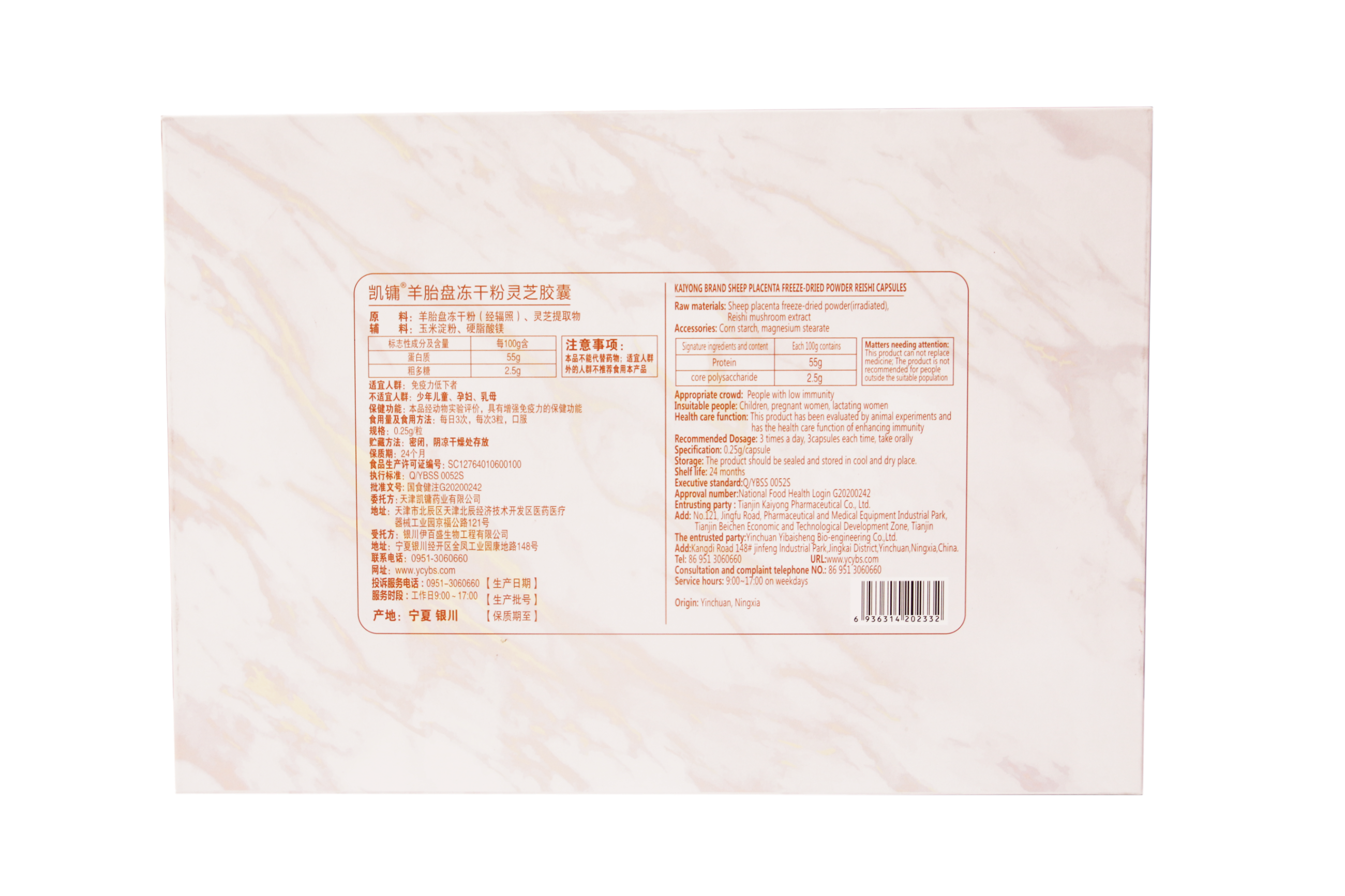 凱鋪”羊胎盤凍干粉靈芝膠囊原料:羊胎盤凍干粉(經(jīng)輻照)、靈芝提取物輔料:玉米淀粉適宜人群:免疫力低下者 不適宜人群:少年兒童、孕婦、乳母 保健功能:本品經(jīng)動物實(shí)驗(yàn)評價(jià),具有增強(qiáng)免疫力的保健功能。食用量及食用方法;每日3次,每次3粒,口服貯藏方法:密閉,陰涼干燥處存放 保質(zhì)期:24個月 食品生產(chǎn)許可證編號:5C12764010600100執(zhí)行標(biāo)準(zhǔn):QYBSS00525 批準(zhǔn)文號;國食健注G20200