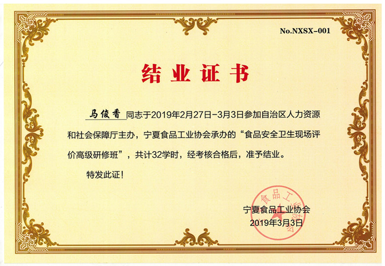品質(zhì)主管馬俊香參加“食品安全衛(wèi)生現(xiàn)場評價高級研修班“順利結(jié)業(yè)